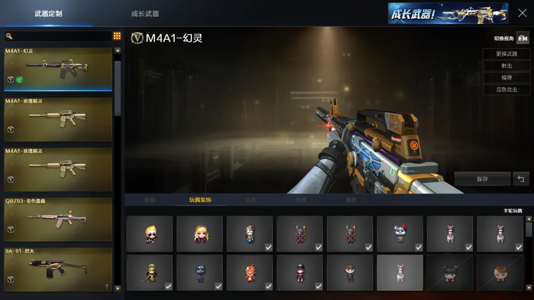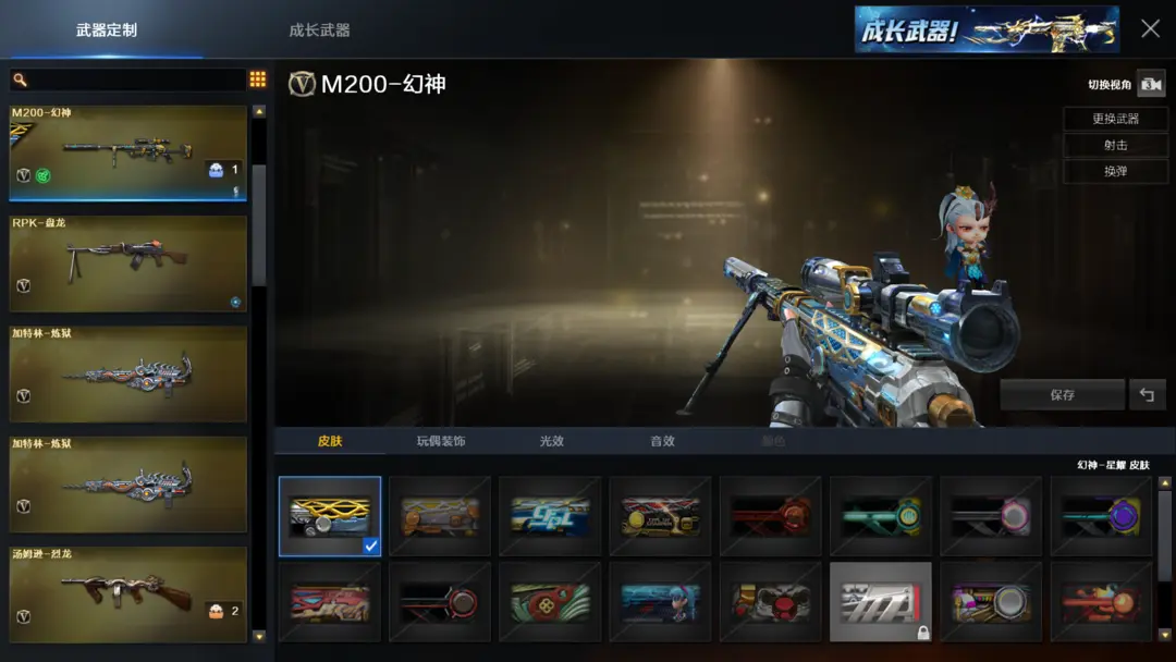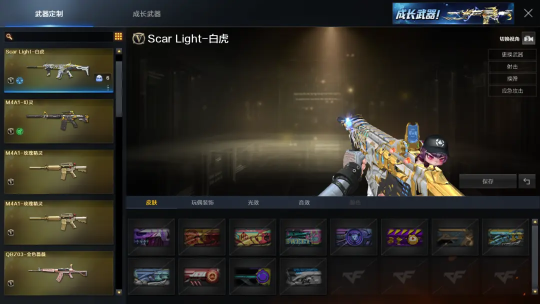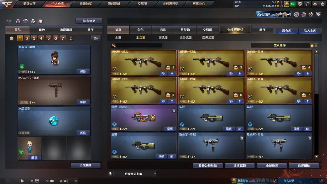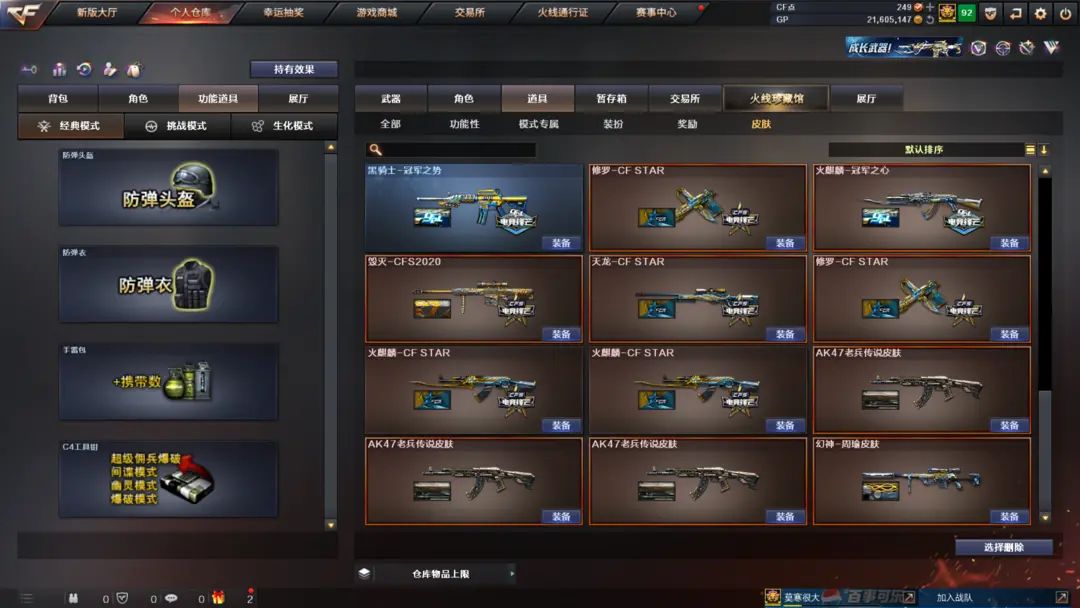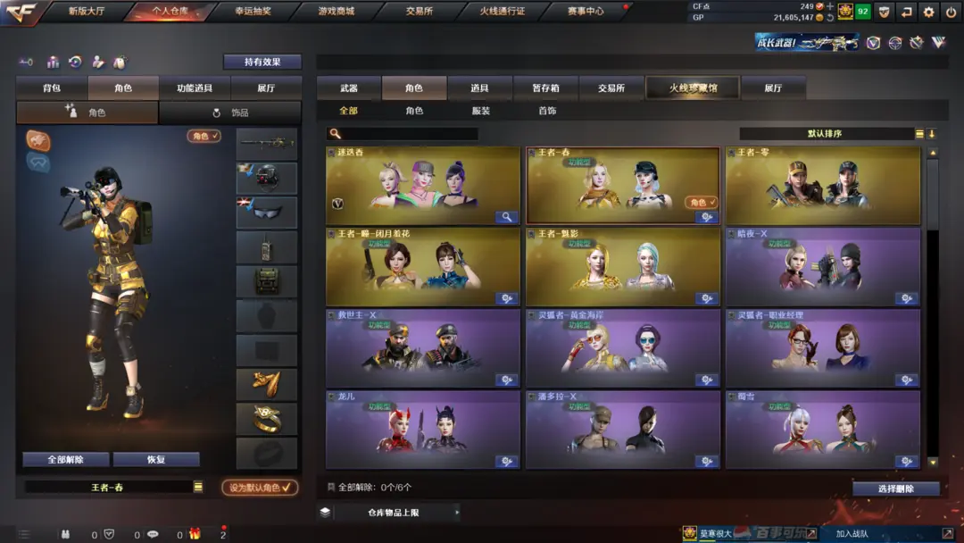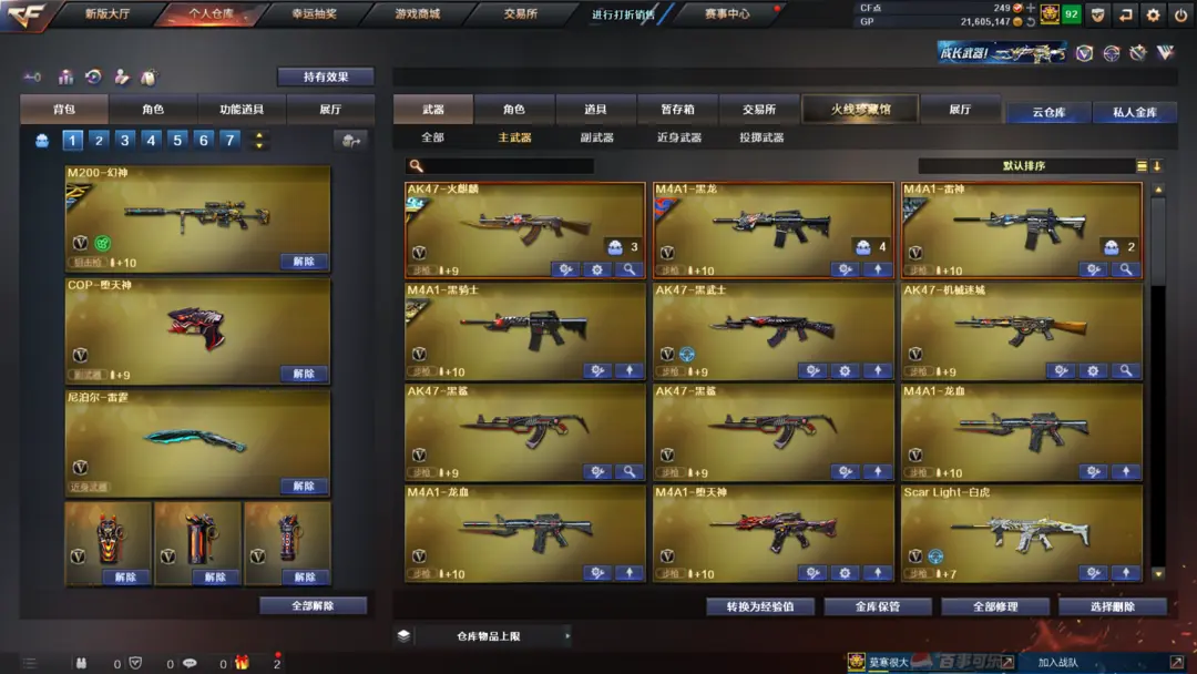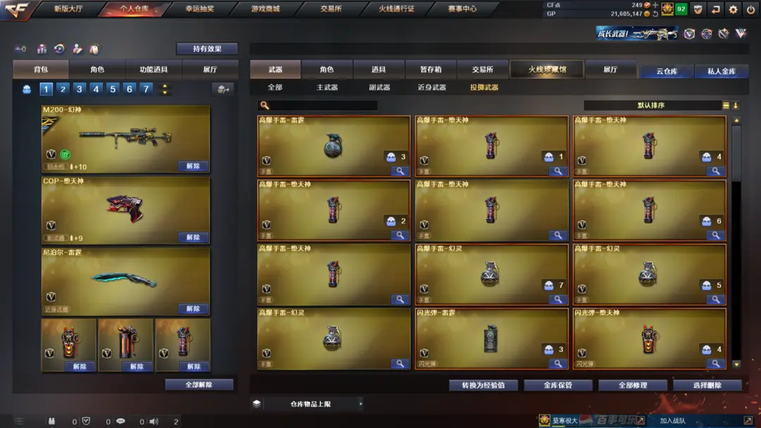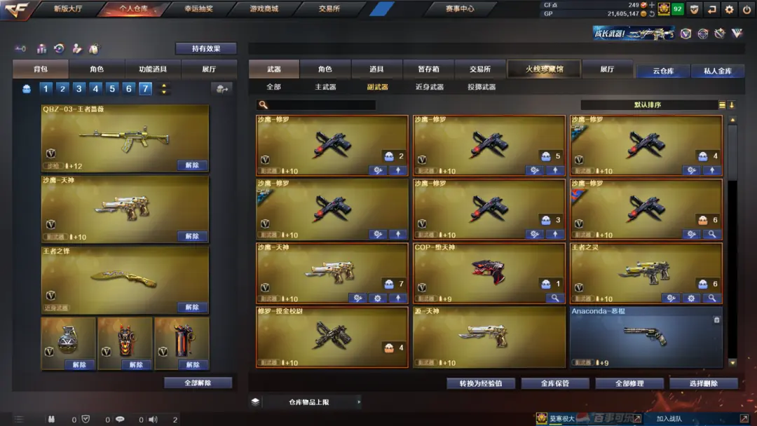 装备有:Barrett-毁灭、M4A1-雷神、M4A1-黑龙、QBZ03-金色蔷薇、M4A1-堕天神、COP-堕天神、龙啸-堕天神、麒麟刺-堕天神、闪光弹-堕天神、烟雾弹-堕天神、Scar Light-白虎、M4A1-幻灵、雷霆之锋、幻灵之锋、炫金火麒麟、炫金毁灭、王者之光、炫金骑士、QBZ-03-王者蔷薇-觉醒版、王者之武-觉醒版、王者之锋-觉醒版、潘多拉、迷迭香、王者-魅影、王者-瞳-闭月羞花、灵狐者-职业经理、王者-零、Barrett-毁灭音效卡、M4A1-雷神音效卡、AK47-火麒麟音效卡、M4A1-黑骑士音效卡、王者之魄金色光效等